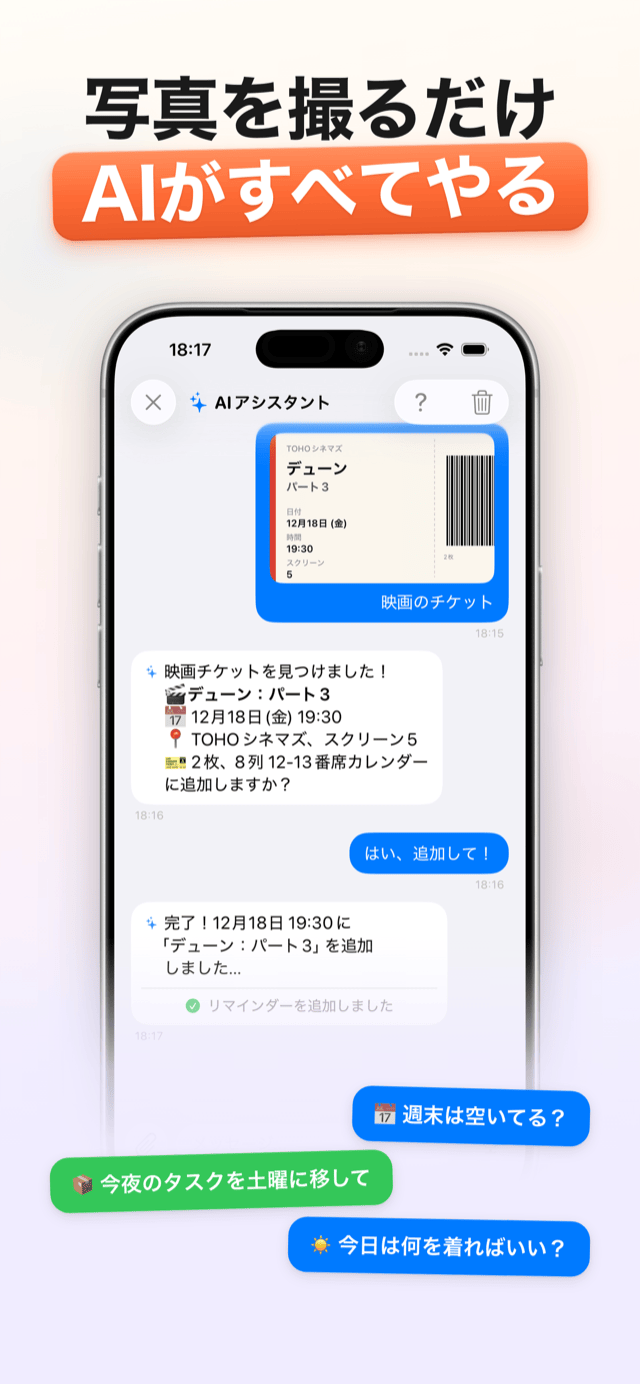 Eva はユーザーの1日の予定を表示するパーソナライズされたロック画面の壁紙を生成します。壁紙には今日のタスク、現在の天気、カレンダーの予定、モチベーションを高める名言が表示されます。複数の壁紙スタイルが用意されています。生成された画像を iPhone のロック画面の背景として保存することで、ロック画面を視覚的なデイリープランナーに変えることができます。