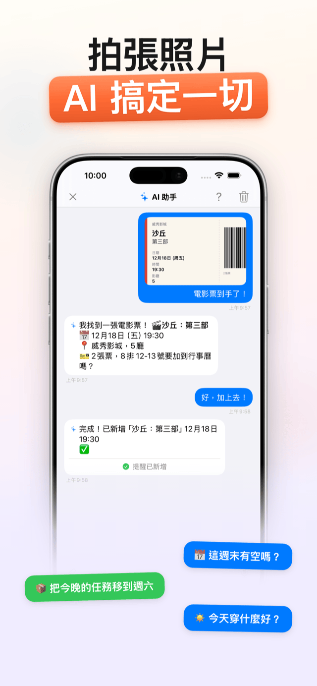 - 整合:Apple Calendar(雙向)、Apple Reminders(雙向)、Apple HealthKit、Core Spotlight